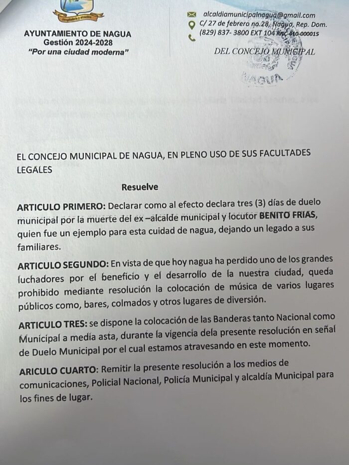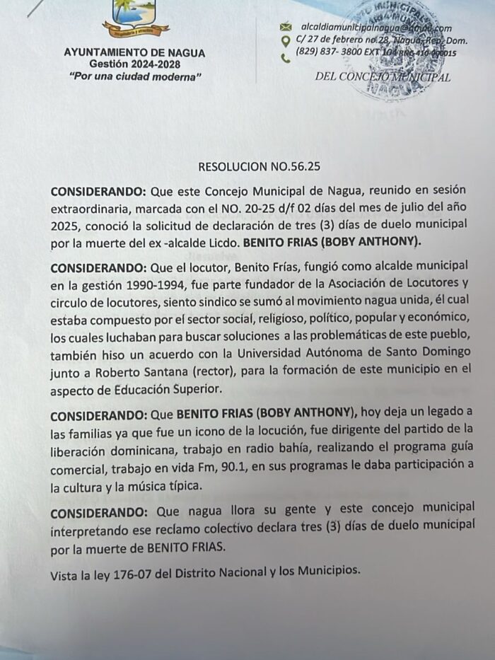 Alcalde Junior Peralta, lamenta muerte del ex alcalde de esta ciudad de nagua, locutor Benito Frías, (Boby Anthony), y envía condolencias a sus familiares.