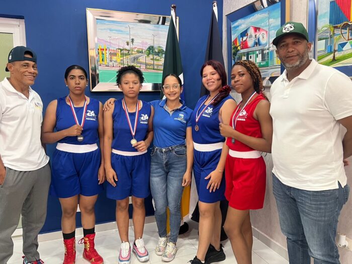 Felices de recibir a las campeonas del torneo nacional de boxeo femenino celebrado en Santiago de los caballeros las cuales juntas a su mentor Aníbal Ozoria, vinieron a agradecer el apoyo de siempre del alcalde deportes Junior Peralta y mostrar las preseas ganadas. La concejal Kishira Batista y el director provincial de deportes Charly Silvestre, les recibieron en representación del alcalde Peralta.
